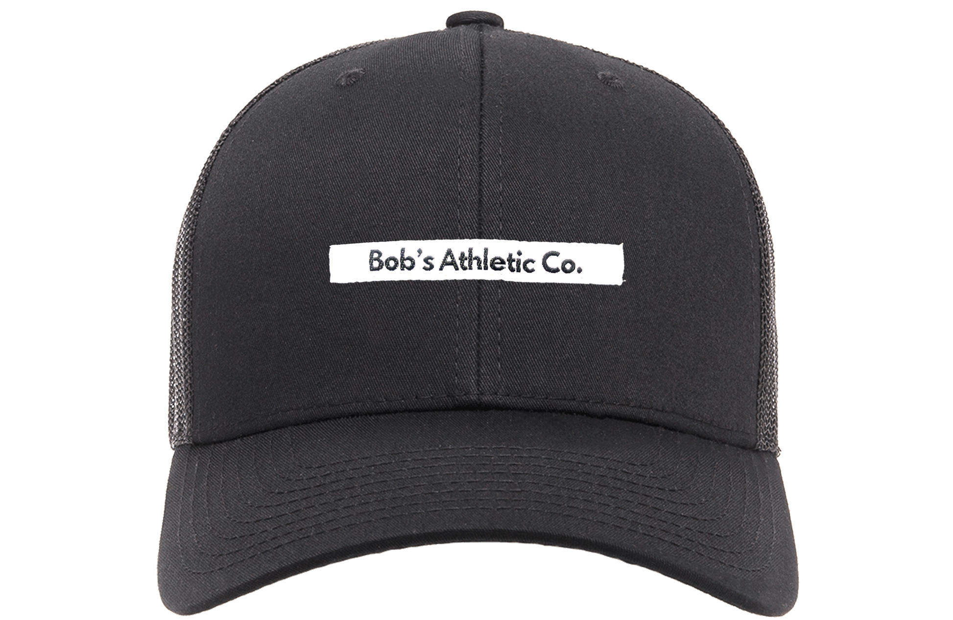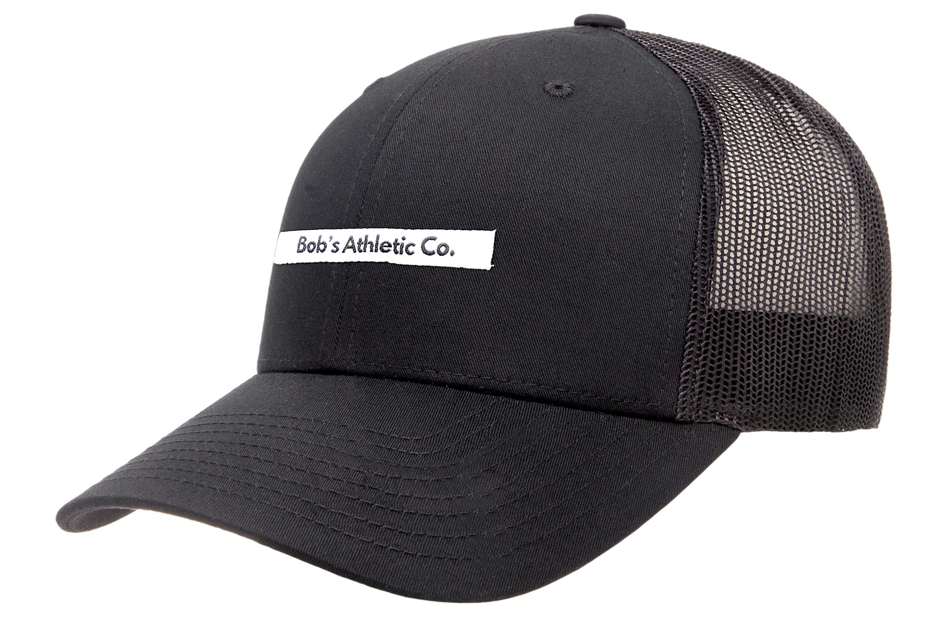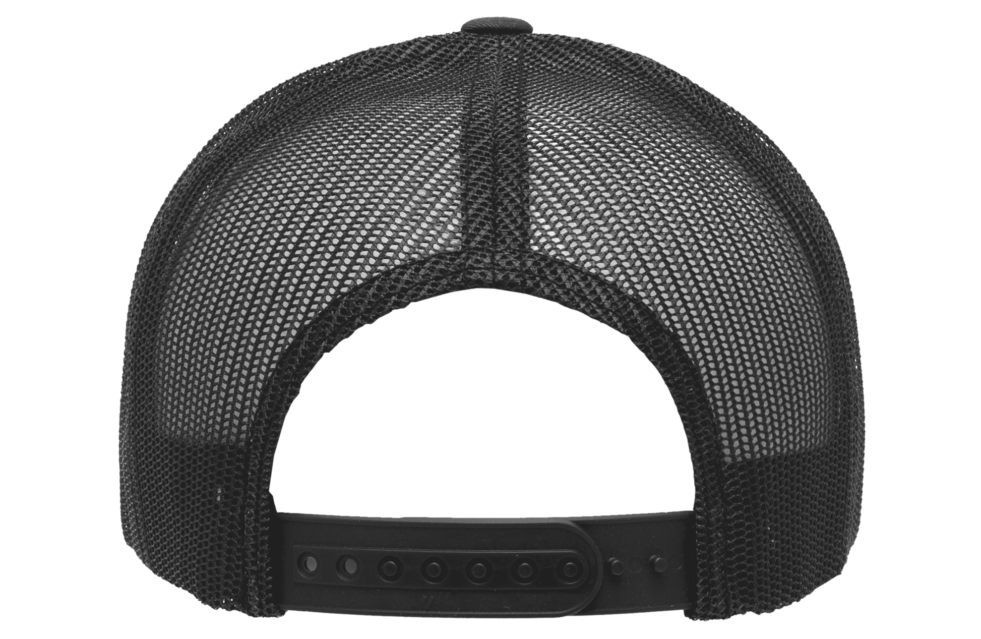 A black 6-panel trucker cap with a breathable mesh back and an adjustable snapback.
